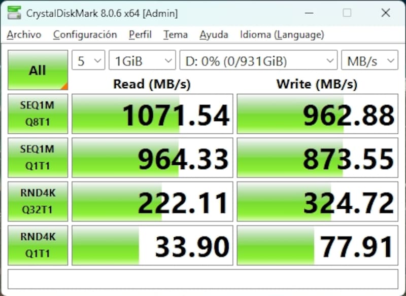 En nuestra prueba de rendimiento con Crystal DiskMark, el XS1000 alcanzó una velocidad de lectura secuencial de 1071 MB/s y una escritura de 962,8 MB/s, valores que demuestran su alto nivel de transferencia. Para poner esto en perspectiva, hay que considerar que los discos rígido externos tradicionales es ofrecen velocidades de lectura que apenas rondan los 120 MB/s, además de ser más voluminosos y pesados.
