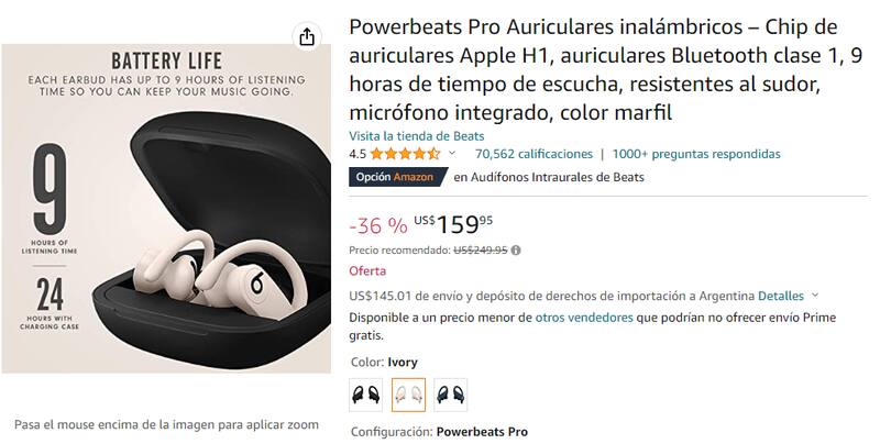 Por otro lado, el sitio de e-commerce estadounidense también ofrece unos auriculares inalámbricos de marca Beats a un precio de u$s 159.