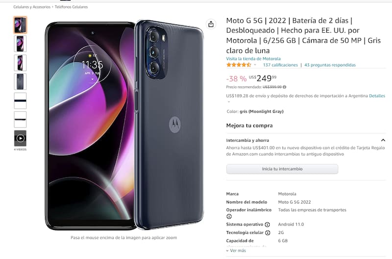 De la misma forma, se consiguen los últimos modelos en oferta, lo que deja a este celular Motorola, por ejemplo, con un precio de u$s 249. Es un celular edición 2022, desbloqueado para uso global.