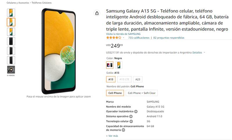 Por ejemplo, este celular Samsung -que incluye capacidad 5G y cámara de triple lente- se consigue por u$s 250 en Amazon.