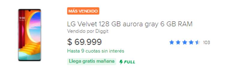 El Smartphone LG Velvet ronda los $70.000 y se consigue en nueve cuotas sin interés en Mercado Libre. Es uno de los modelos más vendidos de toda la plataforma y está disponible en cuatro colores ligeramente tornasolados: blanco, negro, verde y rojo.
