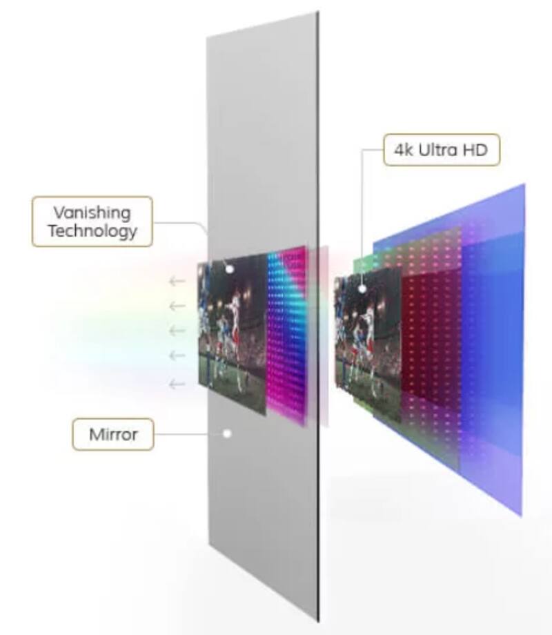 El dispositivo en cuestión es un "Mirror TV" (televisión en un espejo). Es una tele incrustada en un espejo que puede cumplir con las dos funciones a la vez. Se ve como un espejo decorativo, pero se convierte en un vidrio transparente al presionar un botón, permitiendo ver la televisión. El espejo está equipado con un aparato que sensibiliza el vidrio a través de un sensor y deja ver la imagen detrás de él.