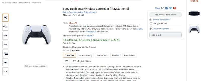 A nivel mundial, Amazon publicó la preventa de la PlayStation 5 y sus accesorios a solo 5 minutos del anuncio oficial. La rapidez sorprendió a todos en redes sociales. El sitio de comercio electrónico ya habilitó la preventa del nuevo Joystick Dual Sense 2 y podés comprar desde Argentina en este link. En este caso, la preventa fue publicada en Amazon Global.El precio del joystick y su base de recarga es de $134,98 euros. Se pueden reservar ambos artículos o por separado.