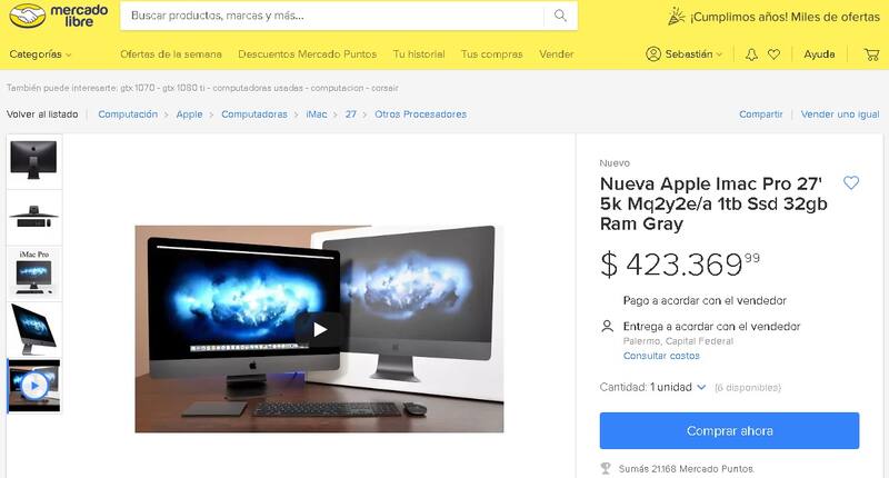 Como muestra basta un botón, según el dicho popular. Una All-in-One iMac Pro de 27 pulgadas, que fuera lanzada por Apple el pasado diciembre, cuesta en los Estados Unidos US$ 4.600. Es lo último de lo último en lo que a computadoras se refiere. Una rápida cuenta resulta en poco más de $180.000, a la cotización actual. Sin embargo, nunca falta el que toma una necesidad de productos innovadores en un mercado local que sufrió durante años una sequía crónica y lo intenta transformar en un negocio millonario: en el portal de e-Commerce MercadoLibre puede encontrarse este equipo arriba de los $420.000; es decir, un precio por encima del 130%, por fuera de cualquier gasto de importación que a uno se le pueda ocurrir.