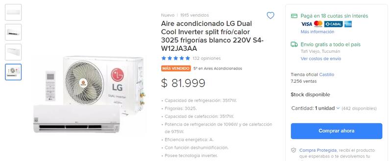 En la categoría de aires acondicionados, el equipo más comercializado es el LG Dual Cool Inverter split frío/calor, de 3025 frigorías, en color blanco (modelo S4-W12JA3AA). Se ofrece por $81.999, con una financiación de hasta 18 cuotas sin interés con tarjetas de crédito seleccionadas.