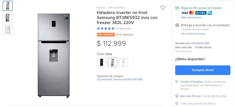 Heladera con tecnología inverter no frost, de Samsung (RT38K5932), color acero inoxidable, freezer y capacidad de 382 litros, se ofrece por $ 112.999 y una financiación de hasta 18 cuotas sin interés mediante tarjetas seleccionadas.