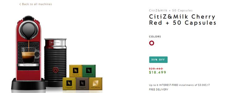 Los amantes del café en cápsula también cuentan con la chance de conseguir su equipo. En la página oficial de Nesspreso, el modelo Citiz&Milk y 50 cápsulas se ofrece con una rebaja de 35% y envío gratuito por $ 18.499, desde los $ 28.460 habituales.