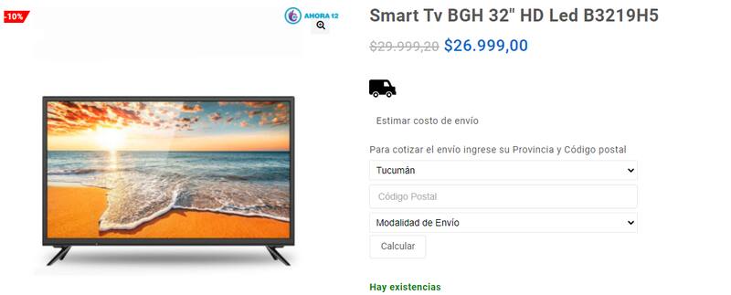 Entre los televisores aparece un Smart TV BGH (modelo B5018UH6) LED con resolución 4K de 50 pulgadas, por $ 56.248, con una financiación de 12 cuotas sin interés.
