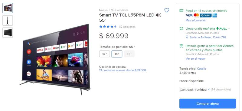 También mediante el gigante de e-commerce fundado por Marcos Galperin puede adquirirse un smart TV LG (modelo 65SM8100PSA) con pantalla LED de 65 y resolución 4K.