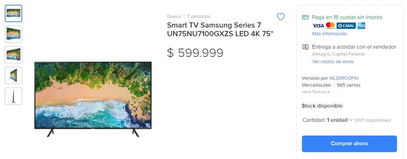 Desde el sitio de Mercado Libre aparece un smart TV Samsung Series 7 (modelo UN75NU7100GXZS) con pantalla LED de 75 pulgadas y resolución 4K.