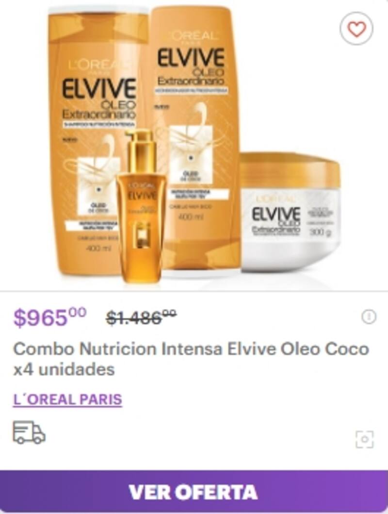 Un combo para la nutrición intensa Elvive Oleo de L'oreal Paris (Coco x 4 Unidades) se ofrece con una rebaja de 35%, hasta los $ 965 (desde los $ 1.486 habituales).