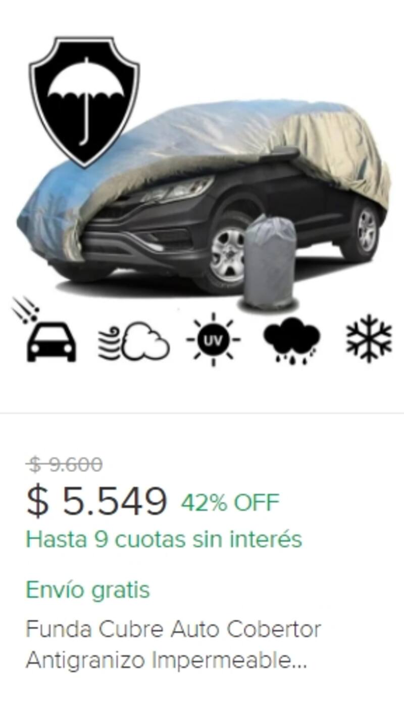 Otra buena oferta es la de una funda cubre autos que aparece en el sitio de ventas online MercadoLibre se ofrece un cobertor antigranizo impermeable marca Unnic “premium , modelo Unnic FUNC041.