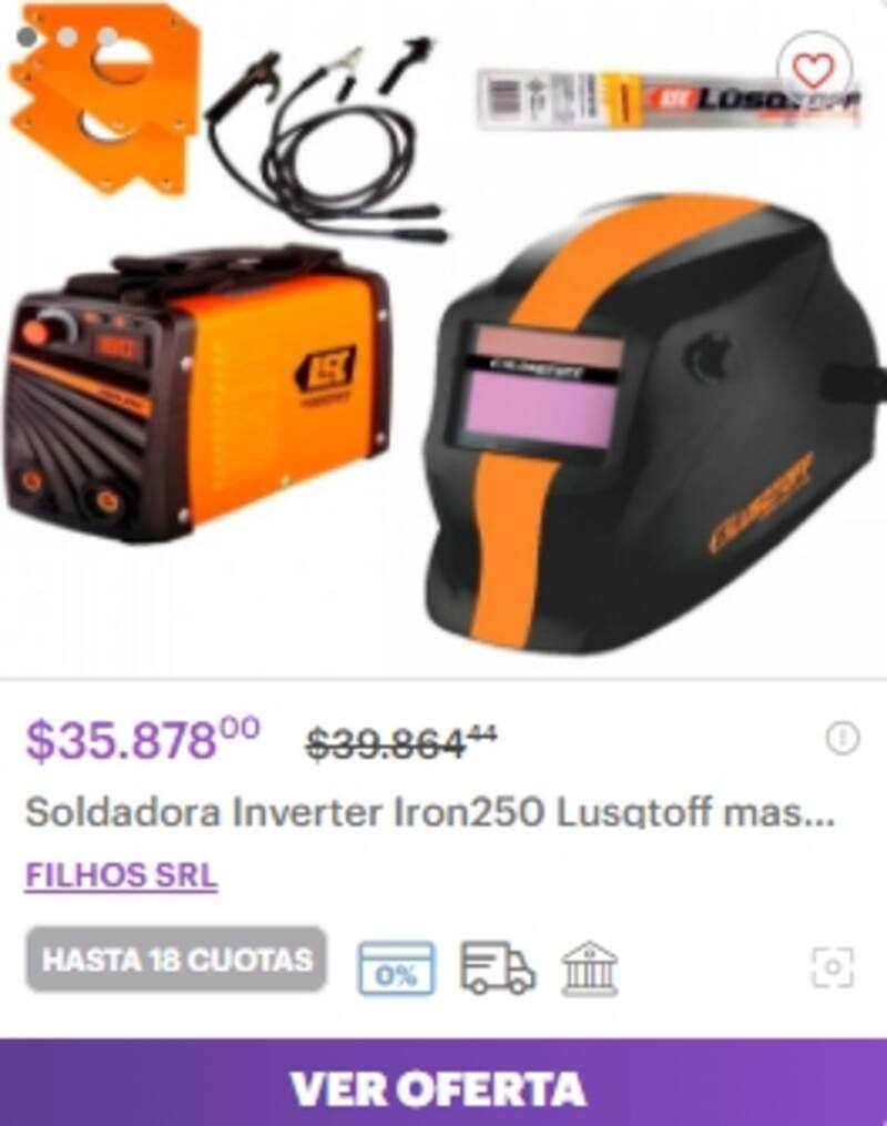Desde la página del CyberWeek, en la sección Mega Ofertas aparece una soldadora Inverter Iron250 Lusqtoff y una máscara St1b P.