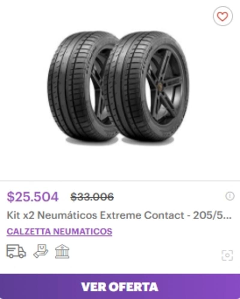 Un kit de 2 Neumaticos 205/55r16 91w Continental Extreme Contact, aparecen en Mercado Libre con un descuento de 15%, por unos $ 25.504, y una financiación de hasta 12 cuotas con tarjetas seleccionadas.