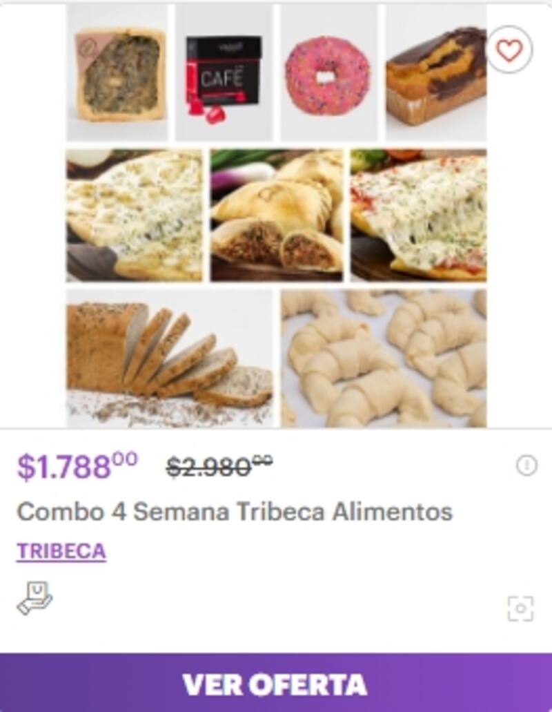 Un combo 4 semanas de la compañía Tribeca, compuesto por diferentes tipos de comidas que, incluyen café, pasteles, pan, budines y empanadas, entre otras, se ofrece por $ 1.788 (desde los 2.980), con una financiación de hasta 18 cuotas (de $ 345,83 cada una).