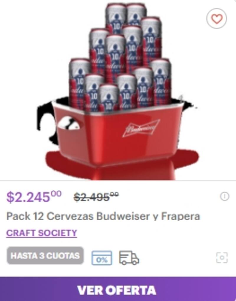 Un pack de cervezas (Budwaiser) y una frapera de regalo es una de las ofertas de Craft Society con un 10% de descuento por $ 2.245 y una financiación de hasta 3 cuotas sin interés.