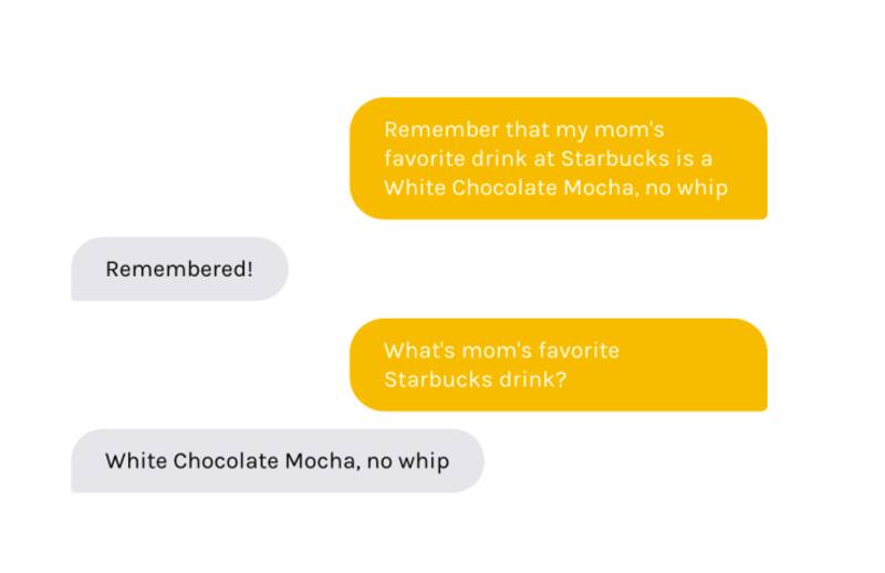 Wonder funcionando. El usuario comenta que la bebida favorita de su madre es el mocca de chocolate blanco, y a continuación el bot es capaz de responder a la pregunta formulada en lenguaje natural