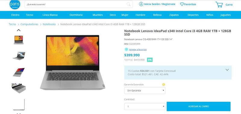En Chile es posible conseguir laptops de prestaciones similares por $399.990 chilenos que en dólar se traduce a u$s 562,86. La notebook chilena es también un modelo Lenovo (IdeaPad s340). Es una máquina con un procesador Core i3, 4GB RAM y un 1TB de almacenamiento (y un storage extra de 128GB SSD).