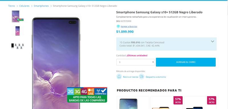 El caso de la tecnología más buscada, los celulares, es similar aunque no tan pronunciada. En Chile, un Samsung Galaxy s10+ de 512GB se consigue por 1.099.990 pesos chilenos (o lo que es lo mismo, u$s 1.547,52).