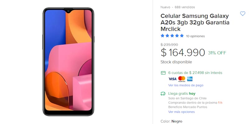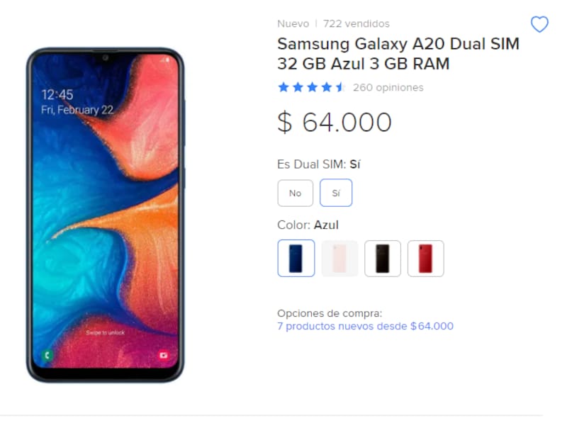 En Argentina, el mismo modelo cuesta $64.000 en MercadoLibre. No obstante, en la tienda oficial de Samsung Argentina, el modelo A20s, con algunas características más destacadas, puede conseguirse por $ 22.999.