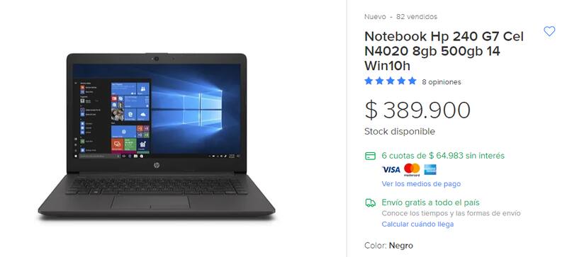La Notebook HP 240 G7 está publicada en el MercadoLibre de Chile a un valor de $389.900. En pesos argentinos sería $37.858. Teniendo en cuesta los impuestos, su valor final es $45.033.En MercadoLibre Argentina, esta misma computadora cuesta $84.985.