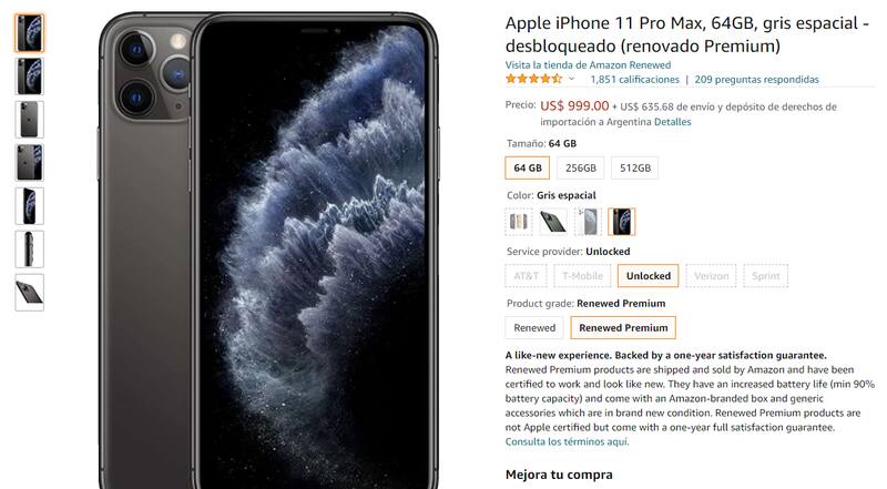 El iPhone es sin dudas el teléfono más codiciado por los argentinos. En nuestro país no es fácil de conseguir y, además, se vende a precios muy por encima de los internacionales. Por caso, en retails nacionales se vende un iPhone 11 Max a $ 250.000 mientras que con importación internacional desde Amazon puede conseguirse a menos de la mitad. Por $ 104.000 se consigue un refurbished desde Amazon, mismo modelo y capacidad.