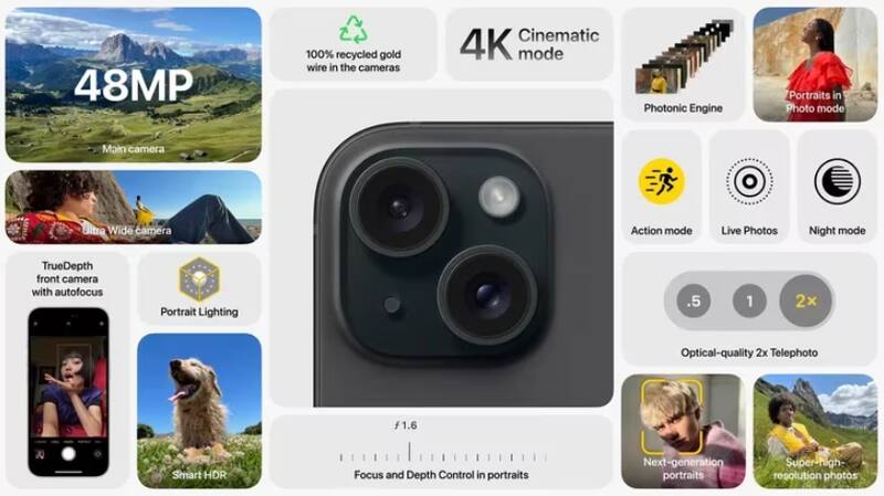 En cuanto al sistema fotográfico, el iPhone 15 producirá fotografías de hasta 48MP gracias a sus sensores especializados y con tecnología quad píxel de 2 nanómetros, 100% de Focus Pixels y una apertura f/1.6.