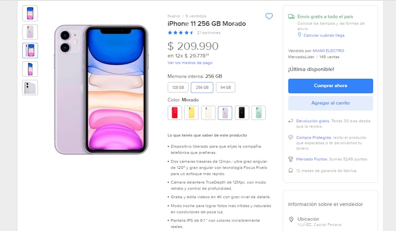 En MercadoLibre, un iPhone 11 64 GB cuesta $176.990 mientras que uno de 128 GB alcanza los $181.000. El modelo de 256 GB alcanza los $209.990.