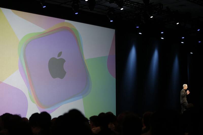 Con el colorido logo de Apple de fondo, Tim Cook da paso a las novedades.