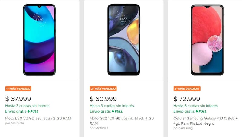 La plataforma incluso facilita el proceso de búsqueda con una sección de "los más vendidos". En el caso de los celulares, pueden encontrarse modelos de gama alta, media y baja, a buenos precios y hasta con cuotas sin interés.