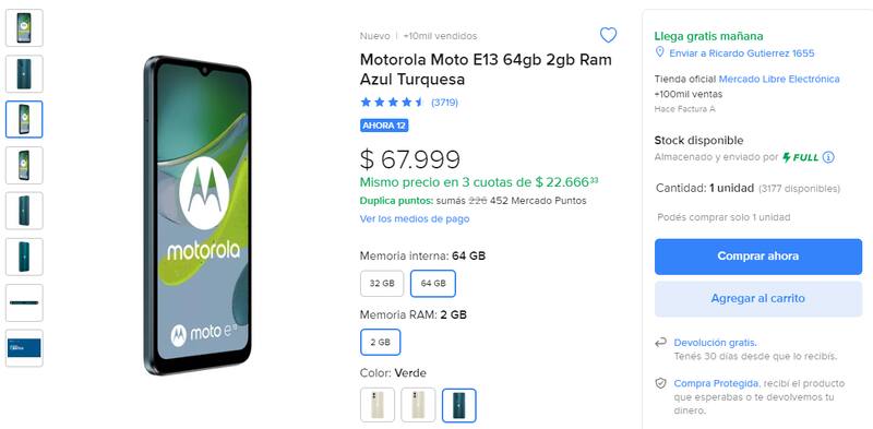 Dado que se trata de un celular de fabricación nacional, está contemplado bajo el programa oficial de financiamiento llamado Ahora 12, que permite pagar el dispositivo en hasta 12 cuotas fijas. Sumado a esto, el Moto E13 no incluye costos adicionales de envío porque forma parte de los productos "Full" de Mercado Libre.