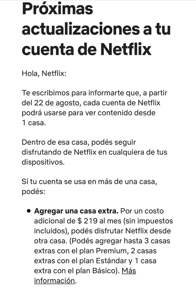 A partir de agosto, cuando se inicia sesión en Netflix en una televisión por fuera del hogar registrado, se ve la opción de agregar casa extra con un cargo adicional por mes.