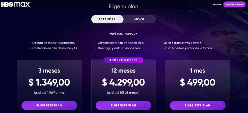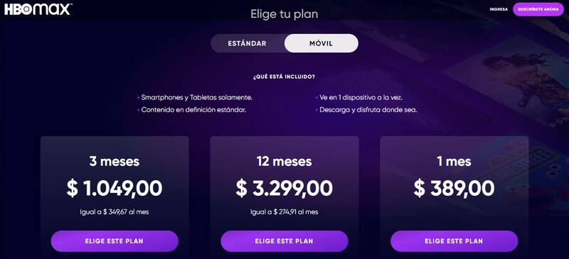 HBO ofrece una de las suscripciones que se engloban dentro de las económicas. El valor de los planes se divide en estándar y móvil.