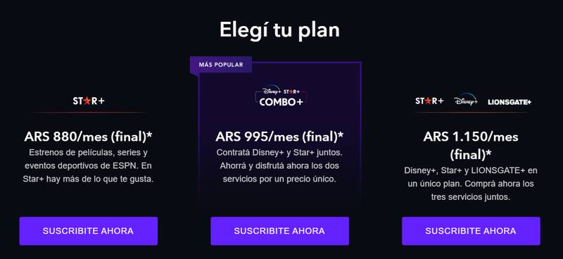 Star+ es otra de las plataformas consumidas en la Argentina. A la misma se puede acceder con una suscripción de $ 880, pero se pueden acceder a los combos con Disney + a $ 995 y sumando Lionsgate+ asciende a $ 1150.