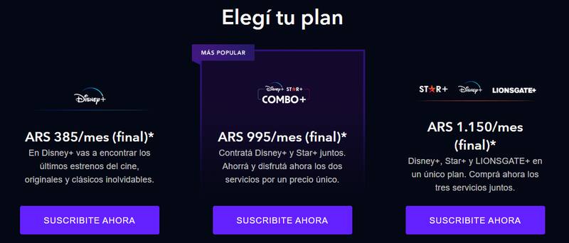 Finalmente, la opción más costosa es de $ 1150. Este combo incluye Disney+, Star+ y Lionsgate+.