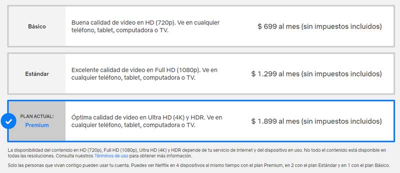 Hoy el plan más barato de Netflix (sin impuestos) es el básico, cuyo valor es de $ 699 al mes. Mientras que el estándar cuesta $ 1299 y, finalmente, el premium sale $ 1899.