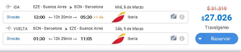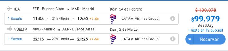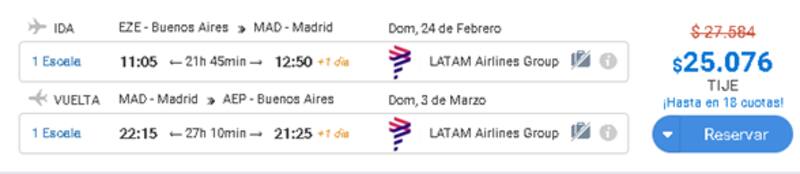 El viaje sale $25.076 –US$ 669- cuando el destino es Madrid, España, saliendo el 24 de febrero de la Argentina y regresando el 3 de marzo.