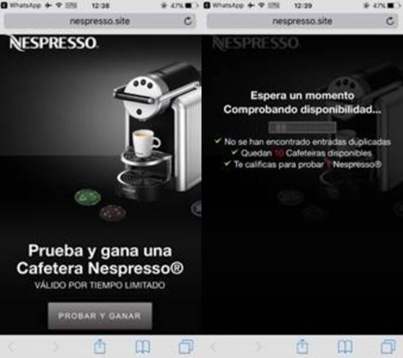 Hay una nueva estafa en WhatsApp que puede tomar desprevenidos a los usuarios. Ahora. ofrecen "probar y ganar" cafeteras de la marca Nespresso a ciertos usuarios de la aplicación, un sitio web malicioso está tratando de instalar un programa adware, que fuerza la exhibición de anuncios en el dispositivo que infecta.