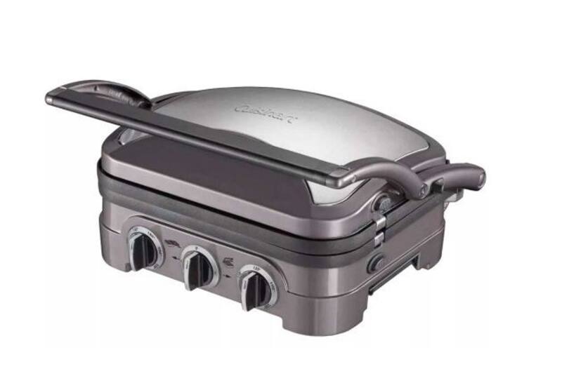 Parrilla Eléctrica Cuisinart (mod. GR40AR): posee un diseño de fácil utilización en acero pulido, y ofrece una apertura de 180 grados. Cuenta con una potencia de 1600 watts, tiene almacenamiento de grasa, junto a una tapa y empuñadura termoaislantes. Su termostato regulable permite la cocción al aire libre y en interiores, pero también elegir entre las funciones: barbacoa, grill, bocadillos, sandwiches, y plancha.