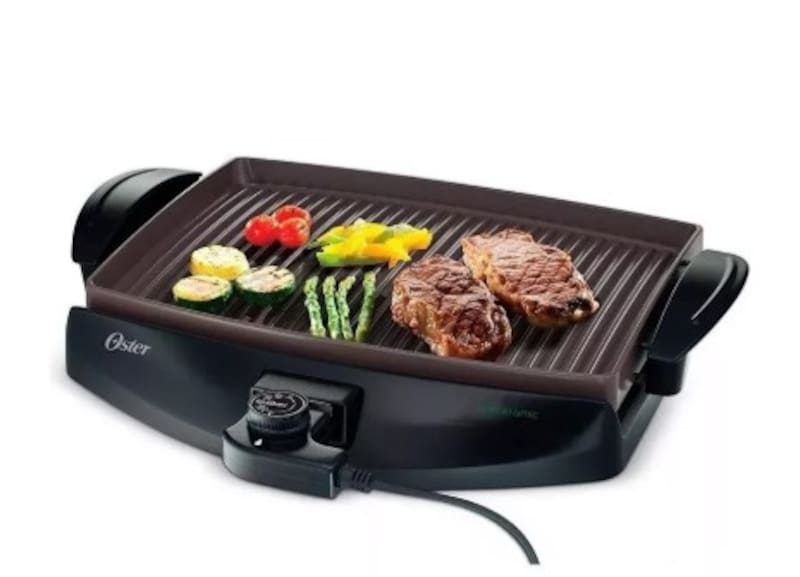 Parrilla Electrica Oster-Grill Antiadherente (mod. CKSTGR4768): Tiene una potencia de 1800 watts, y ofrece un regulador para elegir entre cuatro niveles de temperatura de cocción. La parrilla tiene un ancho de 40 cm por 30 cm de profundidad por 10 cm de altura.
