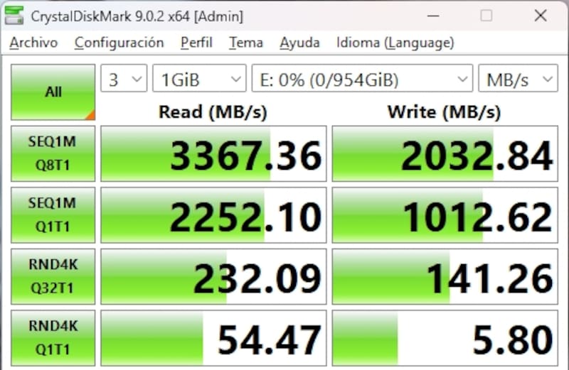 En nuestras pruebas, realizadas en una Mini PC Minisforum AI X1 Pro con puerto USB 4.0, el Mini SSD Biwin CL100 obtuvo velocidades de lectura secuencial de 3367 MB/s y de escritura de 2032 MB/s al medirlo con el software CrystalDiskMark. En simples palabras, es un SSD que “vuela” para lo que es su tamaño.