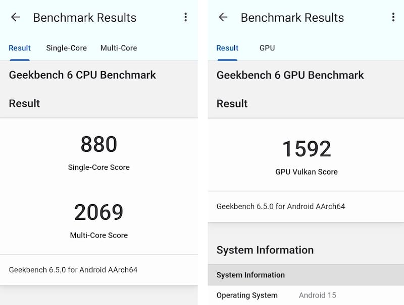 Los resultados en benchmarks lo confirman: en Geekbench 6 obtiene entre 880 puntos en single-core y entre 2069 en multi-core, lo que lo ubica a la par o por encima de varios smartphones de otras marcas en su rango de precio.