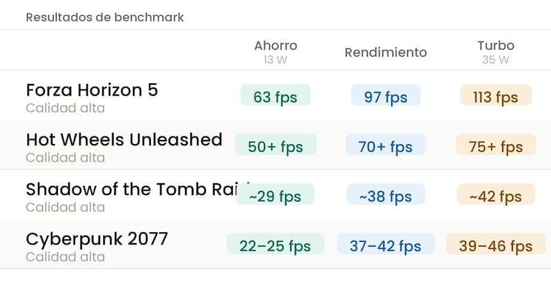Incluso Cyberpunk 2077, uno de los juegos más exigentes del mercado, alcanza entre 39 y 46 cuadros por segundo en configuración alta.