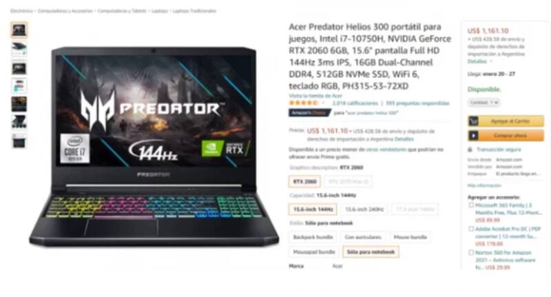 Uno de los principales diferenciales a la hora de comprar en el exterior son los precios. En productos de gaming, la diferencia puede ser muy marcada. Por ejemplo, una notebook Acer Predator Helios 300, con un procesador I7-9750h 16gb de memoria RAM, un disco de almacenamiento de estado sólido (que mejora la performance y la vida útil) de 256gb con una tarjeta gráfica Gtx 1660 Ti (un setup que permite jugar a los juegos más populares como Fortnite o League of Legends) se consigue por $ 240.000.