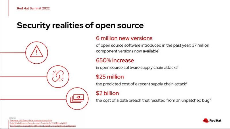 Uno de los focos de la presentación fue la seguridad. "El open source juega un rol central en la nube hibrida, hay 6 millones de versiones nuevas de open source, en el ultimo año, crecieron 650% los ataques a la cadena de provisión de ese software, u$s 25 millones es lo que cuesta un ataque a una cadena de supply y un breach puede costar hasta u$s 2000 millones. La seguridad perimetral ya pierde valor frente a la nube hibrida, no es solo cuidar las cuatro paredes del data center, pero cuando el área de TI está en edge o en otros proveedores se amplia el área de seguridad, y es necesario tener un enfoque holístico para poder tener políticas y reglas de seguridad consistentes", comento Cambareri.
