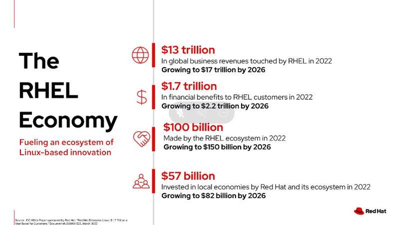 Oportunamente, los voceros de la empresa presentaron datos sobre el sistema operativo a nivel global. Rhel estuvo corriendo en diferentes negocios que movieron u$s 13.000 millones este año y el ecosistema de Rhel en si mismo generó u$s 100.000 millones.