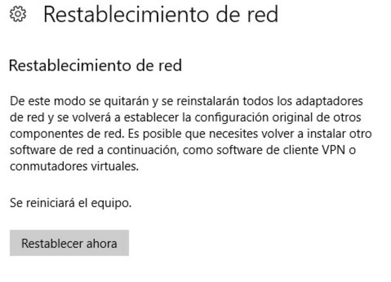 Al final de ese menú aparece la opción “Restablecimiento de red . Una vez que se hace clic, aparece el siguiente mensaje: