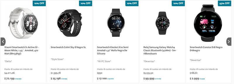 El sitio también ofrece otros rubros de tecnología además de celulares. Por caso, la tienda ofrece varias ofertas en lo que respecta a relojes inteligentes. Hay descuentos de hasta 45% en este rubro y los precios van desde los $3.000 hasta los $ 100.000.