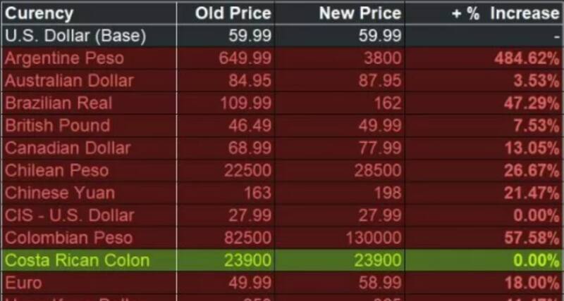 La plataforma de venta de videojuegos compartió un documento donde está el precio recomendado que debe tener cada videojuego según la región -el cuál toma como base un valor de u$s 60 por cada juego-. En el caso de Argentina, el valor pasó de $ 649 a $ 3800 por cada videojuego de u$s 60, lo que sigue representando un dólar relativamente barato pero bastante que no deja de tener un aumento de casi 500%.