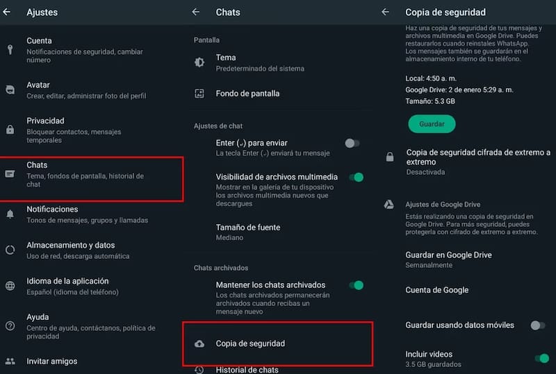 Para hacer las copias de seguridad deWhatsApp y cambiar de celular sin problemas, los usuarios tienen que entrar en Configuración/Ajustes dentro de la app y tocar la opción Chats. Allí podrás ver la opción Copia de seguridad.